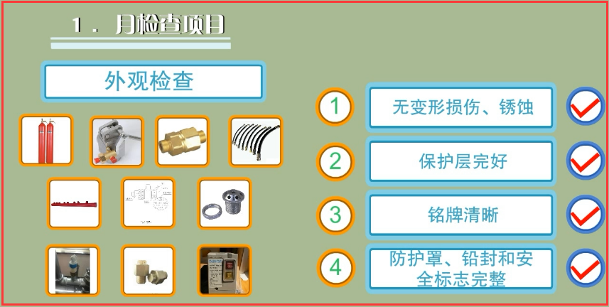 ①滅火劑儲(chǔ)存容器及容器閥、單向閥、連接管、集流管、安全泄放裝置、選擇閥、閥驅(qū)動(dòng)裝置、噴嘴、信號(hào)反饋裝置、檢漏裝置、減壓裝置等全部系統(tǒng)組件應(yīng)無(wú)碰撞變形及其他機(jī)械性損傷,表面應(yīng)無(wú)銹蝕,保護(hù)涂層應(yīng)完好,銘牌和保護(hù)對(duì)象標(biāo)志牌應(yīng)清晰,手動(dòng)操作裝置的防護(hù)罩、鉛封和安全標(biāo)志應(yīng)完整;