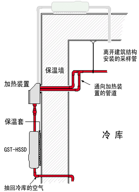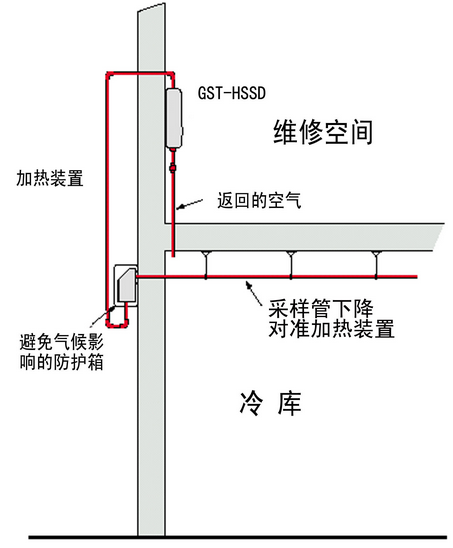 冷庫中采樣管,加熱箱和吸氣式感煙火災(zāi)探測器的相對位置