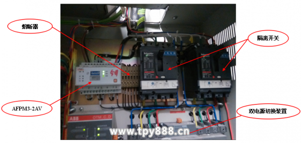 本商場(chǎng)綜合樓項(xiàng)目的AFPM3-2AV三相交流雙電源電壓傳感器安裝于斷路器或隔離開(kāi)關(guān)的輸出端和雙電源切換裝置的輸入端之間,主電源電壓信號(hào)接1,2,3,4這四個(gè)端子,備用電源電壓信號(hào)接5,6,7,8這四個(gè)端子,以位于地下室區(qū)域的消火栓泵配電箱雙電壓監(jiān)控為例,傳感器AFPM3-2AV安裝位置示意圖如圖2所示,實(shí)物安裝位置圖如圖3所示,電壓信號(hào)接線(xiàn)示意圖如圖4所示。