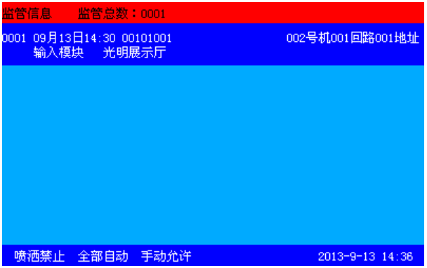 本控制器可在總線上連接輸入模塊,可通過(guò)總線部件設(shè)置成監(jiān)管模式。當(dāng)發(fā)生監(jiān)管報(bào)警后控制器將進(jìn)入監(jiān)管報(bào)警信息顯示(如圖3-5所示),同時(shí)監(jiān)管指示燈常亮。