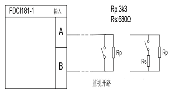 如上圖,AB端引出的兩根線接在被監(jiān)控設備的干節(jié)點觸點兩端(常開或常閉),電阻Rp接在被監(jiān)控設備端。顧名思義,監(jiān)控開路就是指當A、B兩根線任何一根與被監(jiān)控設備的連接中斷就會報開路故障。這也是為什么Rp接在被監(jiān)控設備端的目的。如果接在輸入模塊端,那么即使連線出現中斷,也不報故障,這樣正常的輸入信號就無法傳遞給輸入模塊,消防主機也無法報出事件。